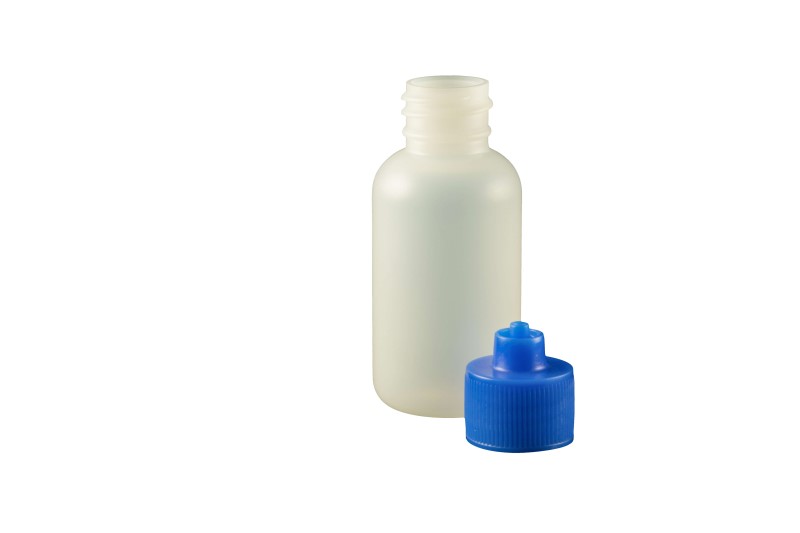 1 oz. Bottle LDPE Boston Round w/ Blue Luer Lock Cap Bag/10