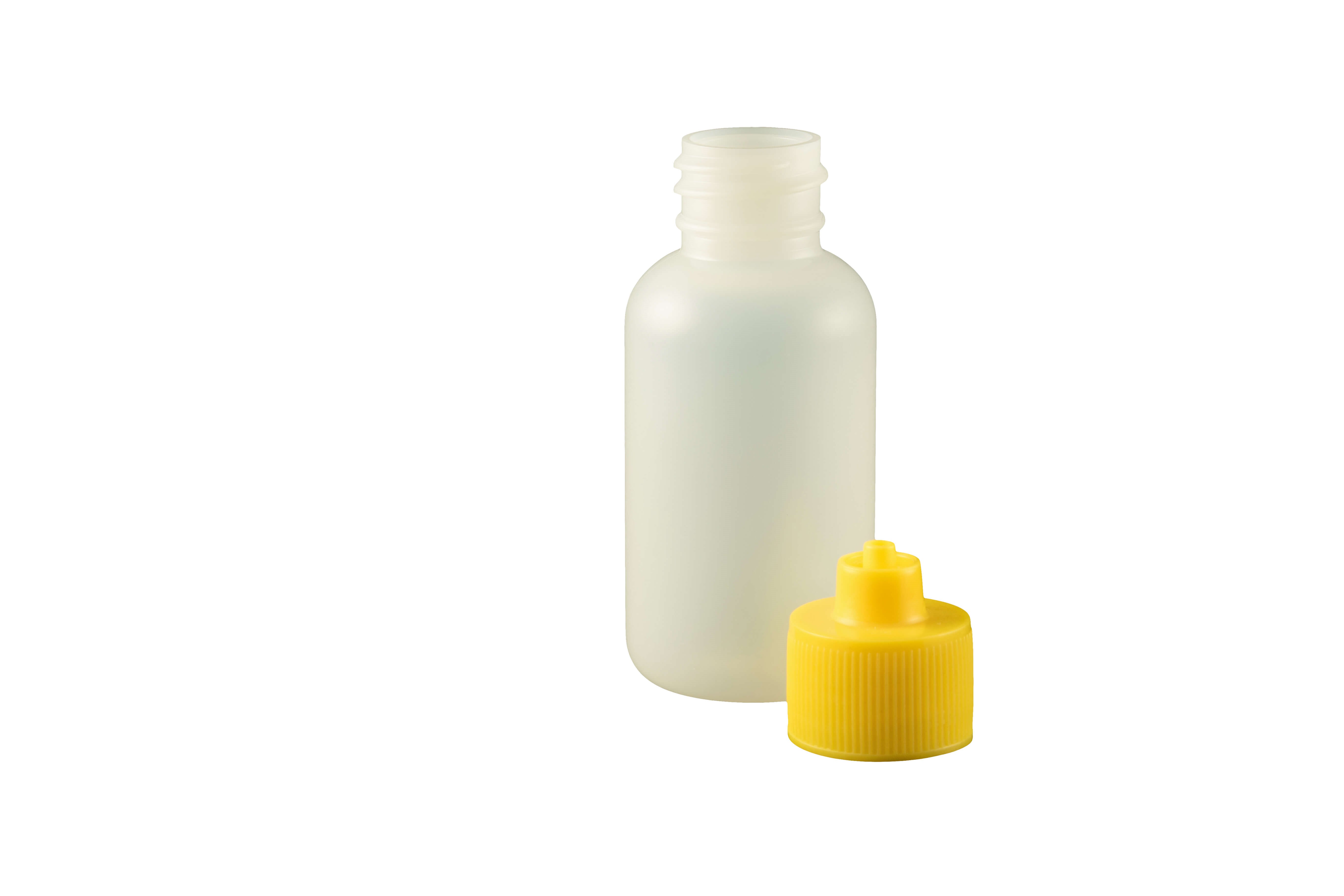 1 oz. Bottle LDPE Boston Round w/ Yellow Luer Lock Cap Bag/10