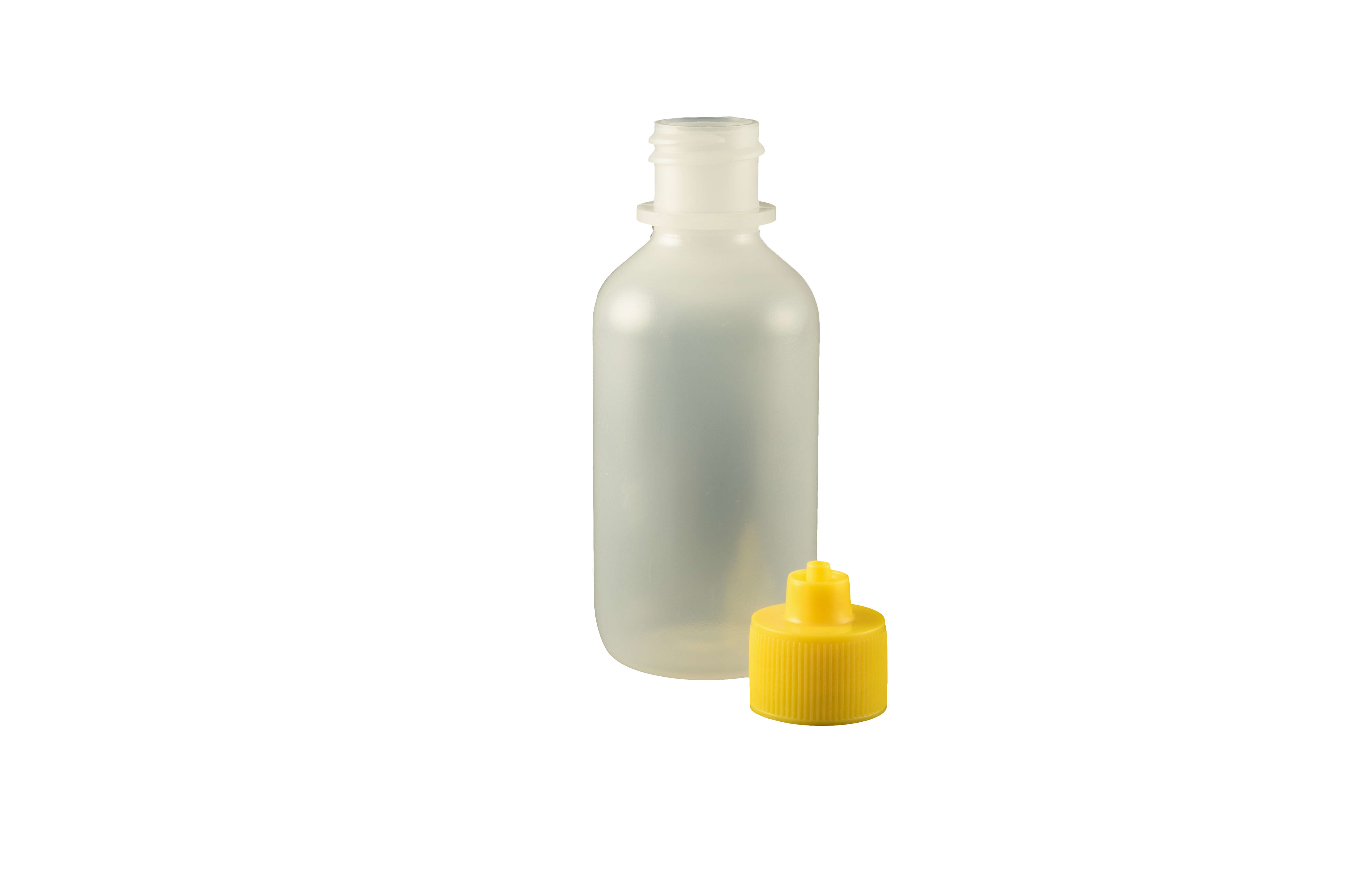 2 oz. Bottle LDPE Boston Round w/ Yellow Luer Lock Cap Bag/10