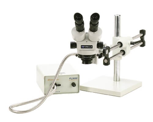 Meiji Stereo-Zoom Microscope System; Standard Range 3.5-45x; 10X Eye Pieces; 0.5x Lens; 150 Watt Fiberoptic Annular Light