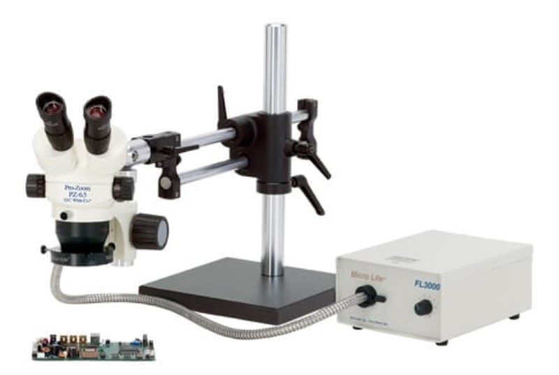 ProZoom 6.5 Stereo-Zoom Microscope; Super-Wide (28mm) 10X Eyepieces; Standard Range 5-65x (up to 390X with optional parts); 16" Tall Ball Bearing Base\\\, Easy 360 main body rotation; 190mm working distance; 0.5X Auxiliary Objective Lens at no charge ($125 value); 6 Diopter Adjustable eyepieces to correct individual eyesight variations; 45 Eyetube inclination; ESD Safe Standard; 150w Fiberoptic Annular Light (Micro-Lite FL3000-A)
