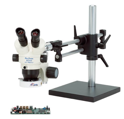 ProZoom 6.5 Stereo-Zoom Microscope; Super-Wide (28mm) 10X Eyepieces; Standard Range 5-65x (up to 390X with optional parts); 16" Tall Ball Bearing Base\\\, Easy 360 main body rotation; 190mm working distance; 0.5X Auxiliary Objective Lens at no charge ($125 value); 6 Diopter Adjustable eyepieces to correct individual eyesight variations; 45 Eyetube inclination; ESD Safe Standard; FL1000 with High-Output Fluorescent Bulb