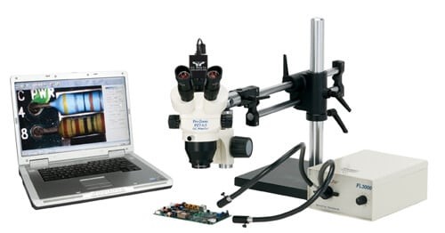 ProZoom 6.5 Trinocular Microscope; Super-Wide (28mm) 10X Eyepieces; ESD Safe Standard; Standard Range 5-65x (up to 390X with optional parts); .3x CCD Adapter; 5MP Ultra-Cam II Hybrid HDMI/USB Camera with Advanced Imaging & Measurement Software Suite; AIMS includes on-screen controls via wireless mouse for Image/Video Capture\\\, Live vs. Frozen Image comparison\\\, Calibrated Measurement\\\, Labeling\\\, Digital Noise Reduction\\\, Export to Excel\\\, and more; Now included FREE ($595 Value) Exclusive PC suite software extension combines all features listed above\\\, along with Extended Depth of Field Stacking\\\, Image Stiching\\\, and more (PC needed); 6 Diopter Adjustable eyepieces to correct individual eyesight variations; Greater working distance\\\, Magnification range\\\, and Field of View than a traditional microscope; 45 Eyetube inclination; 16" Tall Ball Bearing Base\\\, No monitor included; 150w Fiberoptic Dual Point Light (Micro-Lite FL3000-D)