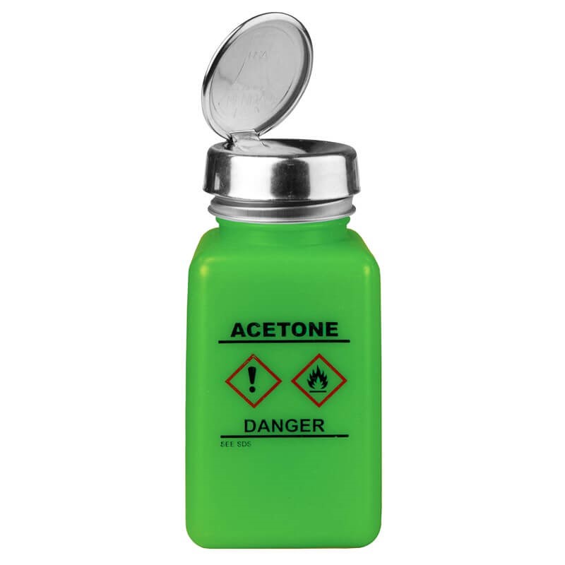 DURASTATIC GREEN HDPE BOTTLE\, ONE-TOUCH\, 6 OZ\, HCS LABEL ''ACETONE''