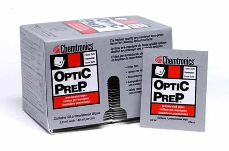 Optic Prep Presaturated Wipes are high quality premoistened lens-grade tissues for cleaning optical surfaces. These highly effective cleaning wipes are ideal for cleaning and polishing optical surfaces\, lenses\, photographic equipment\, CRT and LCD screens and instruments. Optic Prep is safe for use on Fiber Optic Connectors. Optic Prep Presaturated Wipes contain ultra-pure isopropyl alcohol (65% IPA / 35% Pure Water) on an ultra-soft\, lens-grade tissue. - Safely cleans and polishes optical surfaces\, lenses\, photographic equipment\, LCD and CRT screens and instruments - Evaporates quickly\, leaves no residue - Compatible with most plastics\, glass and metals - Mild nonabrasive solvent - Quickly removes dust\, oils and contaminants - Safely cleans and polishes optical surfaces\, lenses\, photographic equipment\, fiber optic connectors and instruments - Innovative formula gently cleans LCD and plasma screens