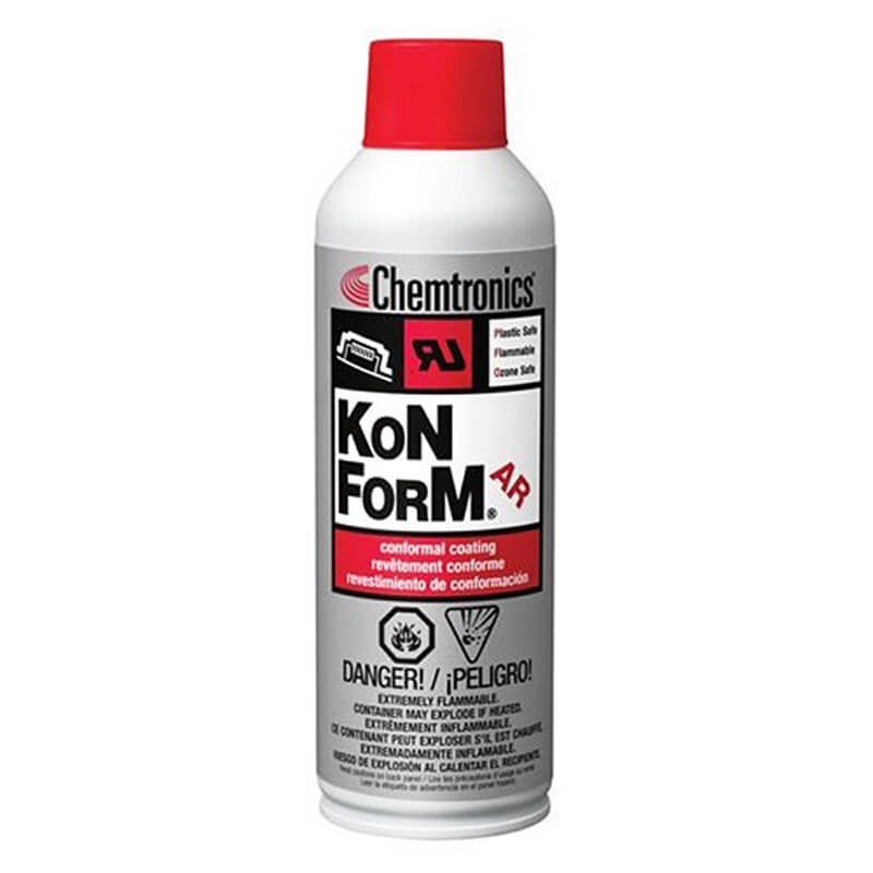 Konform AR (11.5 oz) is ideal for providing insulation against high-voltage arcing and corona shorts. This extremely effective acrylic conformal coating provides a hard\, durable protective barrier against humidity\, salt\, corrosive vapors and fungus for printed circuit board and electronic assemblies. Konform AR resin meets MIL-I-46058C\, Type AR. - Acrylic coating working temperature from -75F/-59C to 279F/137C - High dielectric strength of 8300 volts/mil - Meets Mil-I-46058C\, Type AR - Compliant to IPC-CC-830A - RoHS Compliant - Provides excellent acid resistance - Will not discolor over time under normal use - Easily repairable - Contains a UV indicator for thorough Quality Control inspection - UL Recognized\, File E76307 - Extends component life by protecting against adverse environments - Resists moisture\, salt\, fungus\, corrosive vapors\, and severe environments - Designed to provide effective insulation against electrical shorts and harsh environments