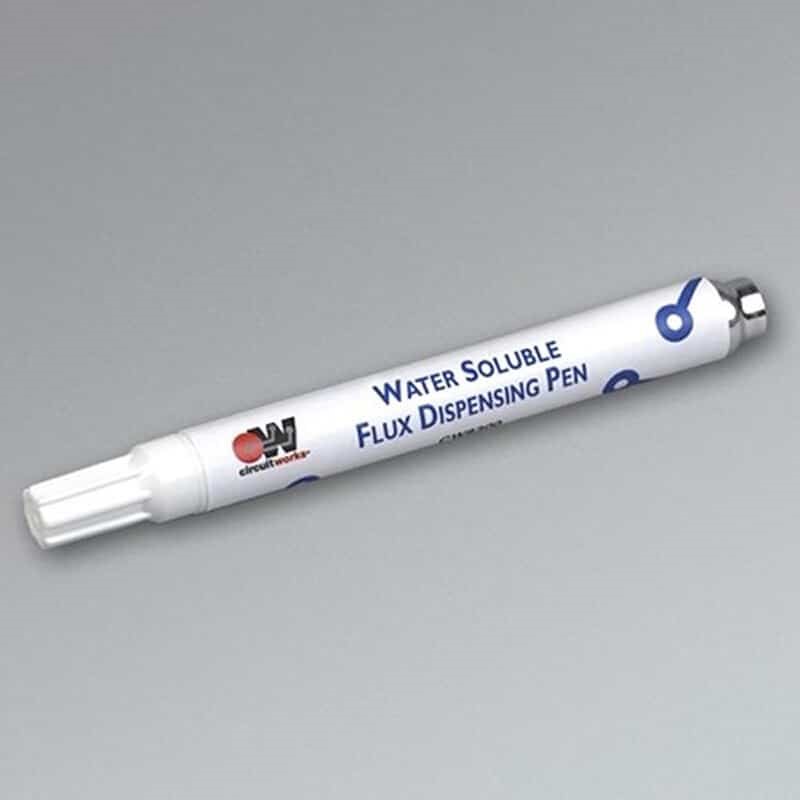CircuitWorks Water Soluble Flux Pen (9 g pen) is designed specifically to apply water soluble flux with precision control. The Water Soluble Flux consists of a neutral pH organic water soluble flux compatible with most solder masks. The high activity organic product cleans easily with water\, reducing cleaning cost. - Applies a neutral pH organic water soluble flux for rapid soldering - Chisel tip marker provides exact delivery of flux to surface - Flux meets ANSI/IPC J-STD-004\, ORH1 Classification - Easily removed with water - RoHS compliant