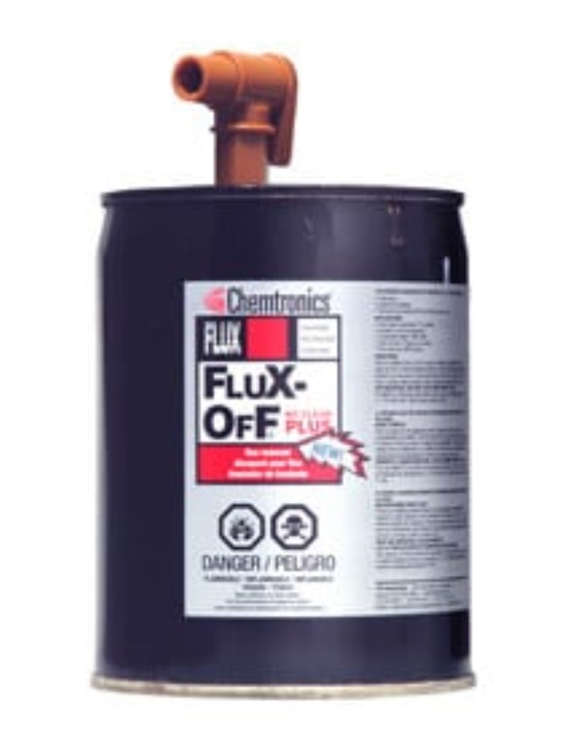 Flux-Off No Clean Plus Flux Remover (1 gal) is an extra strength solvent that removes heavy and encrusted flux deposits. This high pressure aerosol or bulk liquid penetrates quickly to remove all types of flux\, oxide particles\, dust\, grease and oil\, then evaporates quickly leaving no residues. - Removes all types of encrusted\, baked on flux - Extra cleaning strength - Flammable - Dries fast - Leaves no residue - All-Way Spray valve - even sprays upside down - Available with BrushClean System - Removes all types of rosin-based and synthetic no-clean fluxes - Minimizes white residue formation
