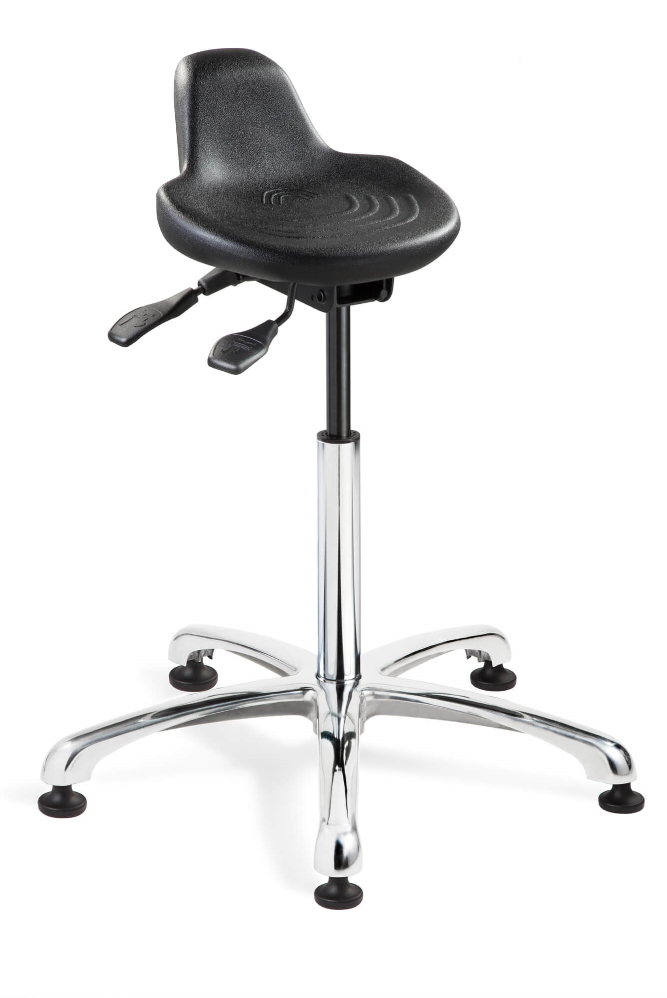 Sit Stand, Black Polyurethane Seat, Polished Aluminum Base, Mushroom Glides, 22"-32" Seat Height Adj., 300lb Weight Capacity, 12yr Warranty / Color Options: Black Polyurethane / Compatible Arms: Not Available / Compatible Casters: Not Available