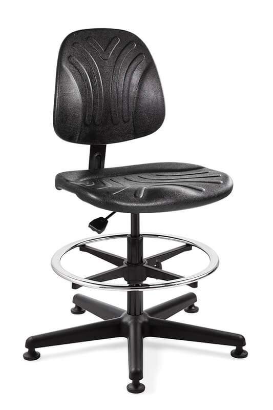 Dura Heavy-Duty Black Polyurethane Chair, Non-Tilt, Black Nylon Base, 20" Adj. Flat Chrome Footring, Mushroom Glides, 21" - 31" Seat Height Adj., 350lb Weight Capacity, 12yr Warranty / Color Options: Black Polyurethane / Compatible Arms: Not Available / Compatible Casters: 3750S/5