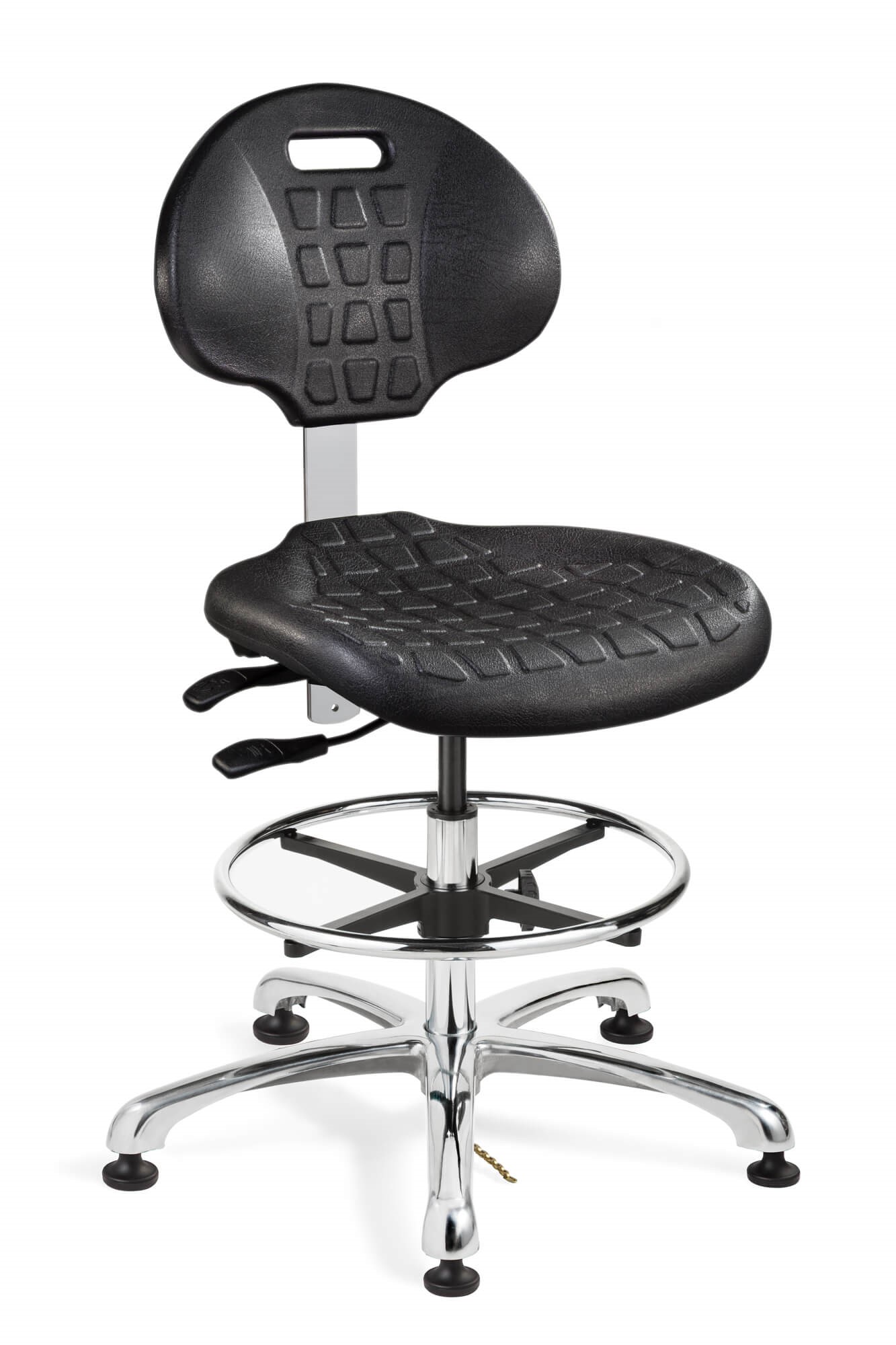 Everlast ESD Black Polyurethane Chair, Articulating Seat & Back Tilt, Polished Aluminum Base w/Brass Drag Chain, 18" Adj. Chrome ESD Footring, ESD Mushroom Glides, 20.5" - 30.5" Seat Height Adj., 300lb Weight Capacity, 12yr Warranty / Color Options: Black Polyurethane / Compatible Arms: AAE / Compatible Casters: CARD5S, IBCS-ESD, RBCS-ESD