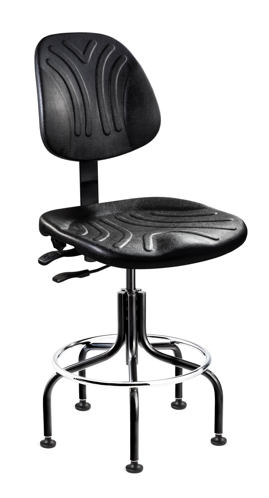 Dura Heavy-Duty Black Polyurethane Chair, Articulating Seat & Back Tilt, Black Tubular Steel Base, 19" Welded Footring, Mushroom Glides, 24"-29" Seat Height Adj., 350lb Weight Capacity, 12yr Warranty / Color Options: Black Polyurethane / Compatible Arms: AA / Compatible Casters: 3750S/5