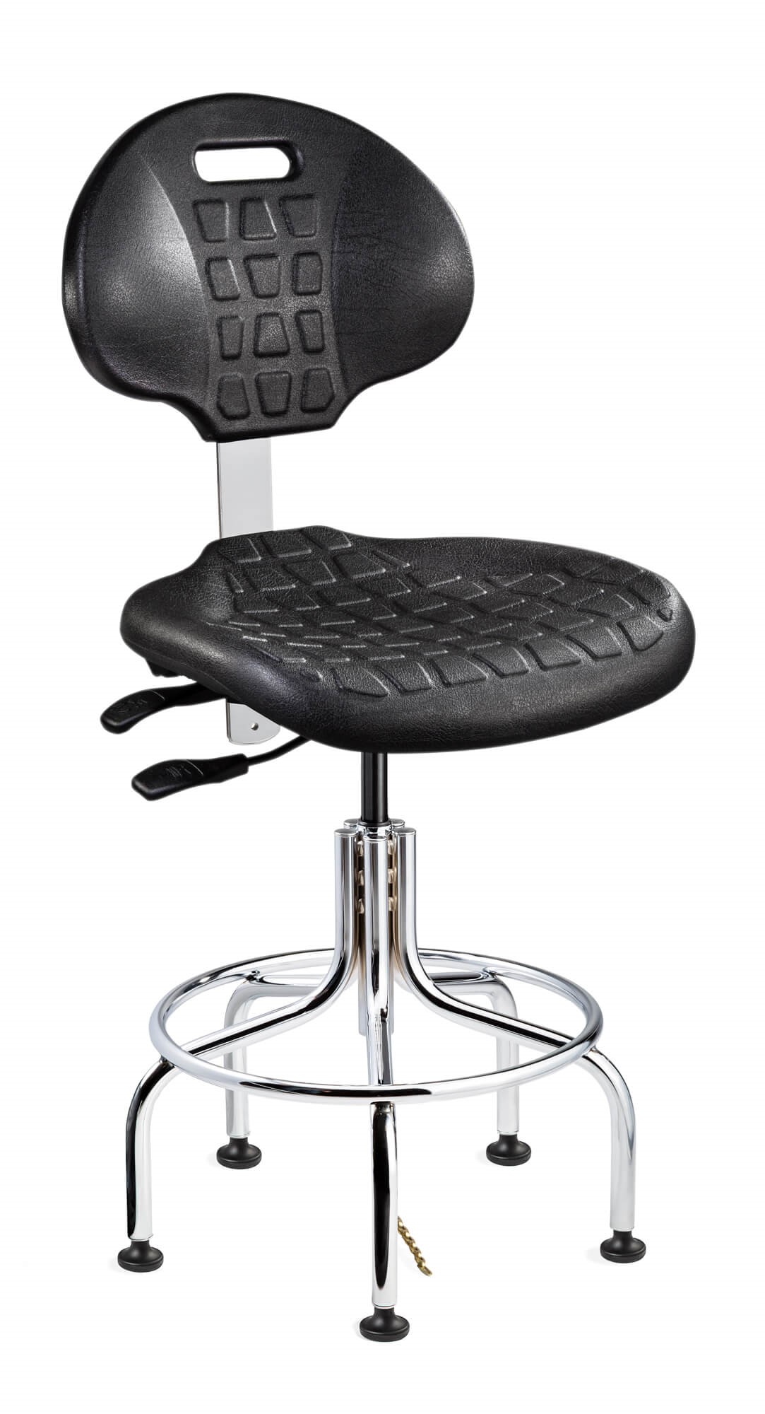 Everlast ESD Black Polyurethane Chair, Articulating Seat & Back Tilt, Chrome Tubular Steel Base w/Brass Drag Chain, 19" Welded Footring, ESD Mushroom Glides, 24"-29" Seat Height Adj., 300lb Weight Capacity, 12yr Warranty / Color Options: Black Polyurethane / Compatible Arms: AAE / Compatible Casters: CARD5S, IBCS-ESD, RBCS-ESD