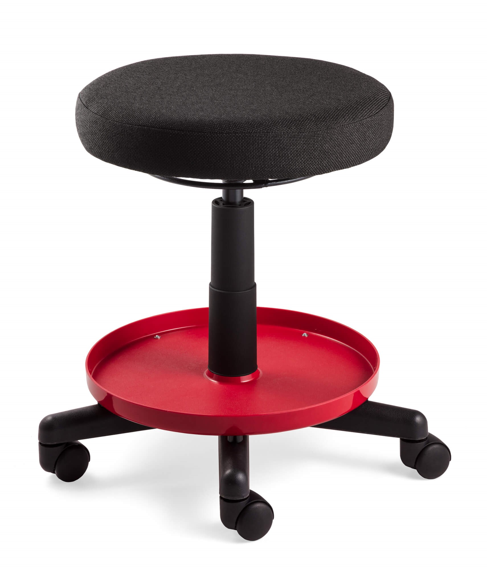 Value-Line Maintenance Repair Stool, Upholstered Fabric Seat, 16" Diameter Plastic Storage Tray, Dual-Wheel Carpet Casters, 18"-22.5" Seat Height Adj., 300lb Weight Capacity, 5yr Warranty / Color Options: Black / Compatible Arms: Not Available / Compatible Casters: Included