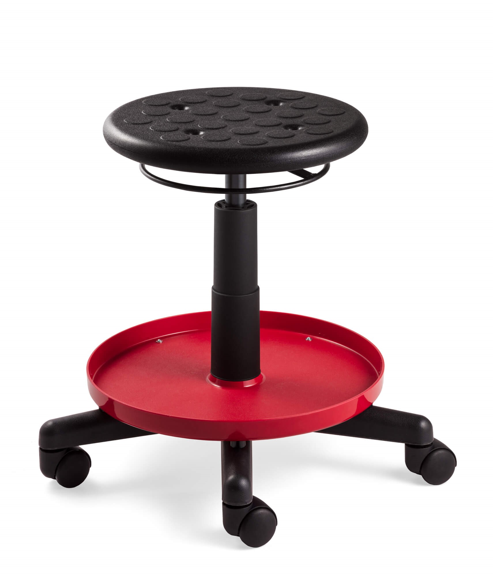 Value-Line Maintenance Repair Stool, Polyurethane Seat, 16" Diameter Plastic Storage Tray, Dual-Wheel Carpet Casters, 16"-20.5" Seat Height Adj., 300lb Weight Capacity, 5yr Warranty / Color Options: Black / Compatible Arms: Not Available / Compatible Casters: Included