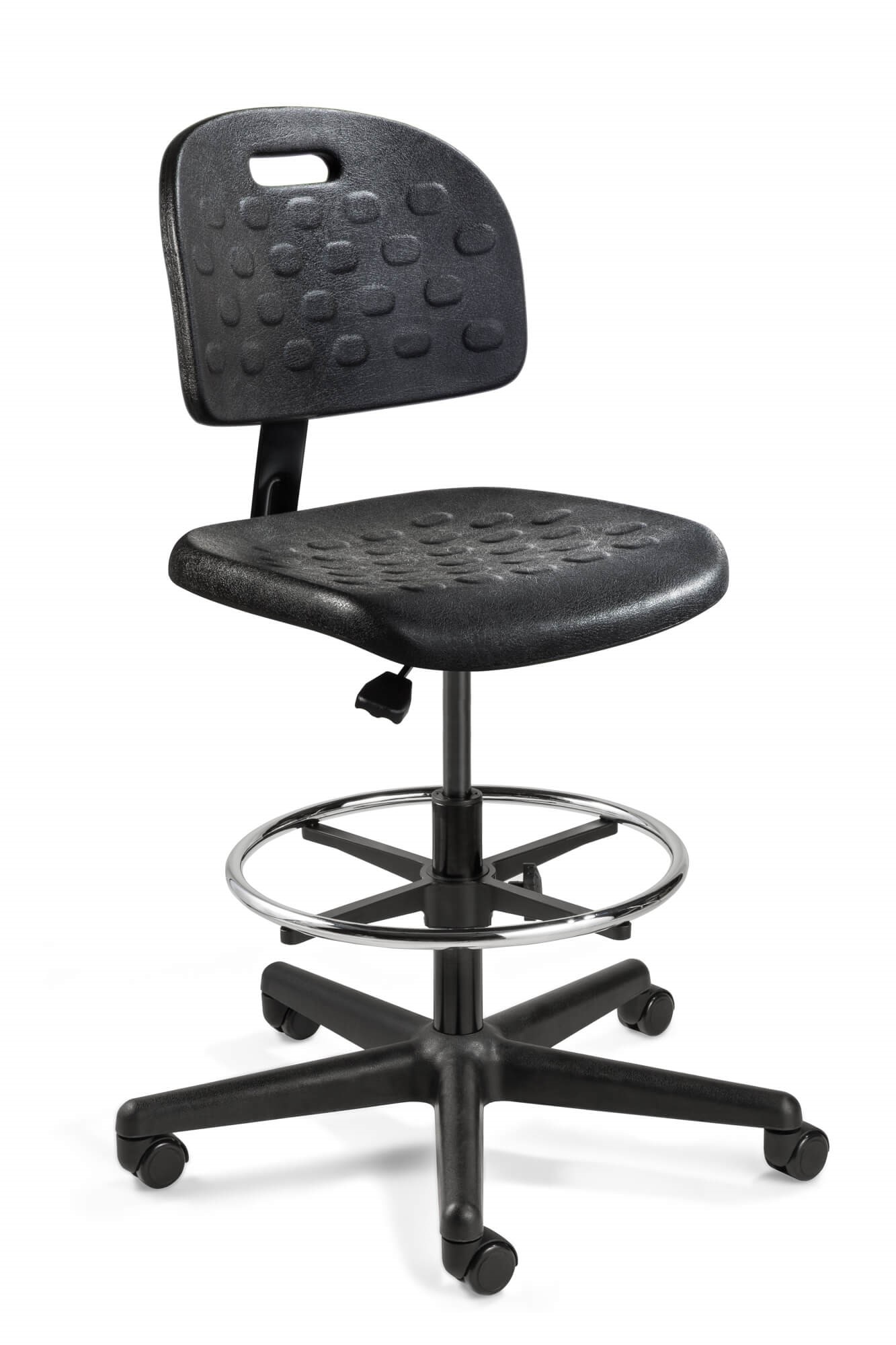 Breva Black Polyurethane Chair, Black Nylon Base, 18" Adj. Chrome Footring, Hard Floor Casters, 22-1/2"-32" Seat Height Adj., 300lb Weight Capacity, 5yr Warranty / Color Options: Black / Compatible Arms: Not Available / Compatible Casters: Included