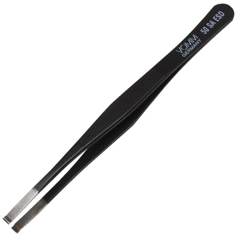 - Description: Vomm brand sturdy, transistor handling tweezers with flat tips and ESD safe coating