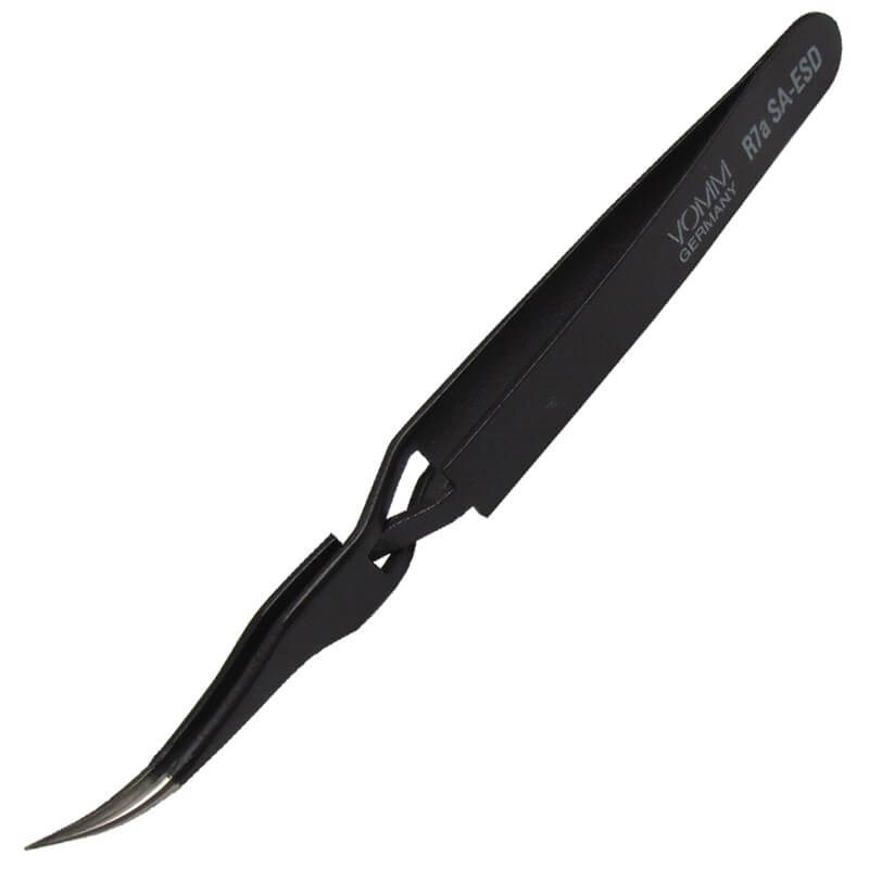 - Description: Vomm brand style 7 (curved) reverse acting tweezers with very fine tips and ESD safe coating