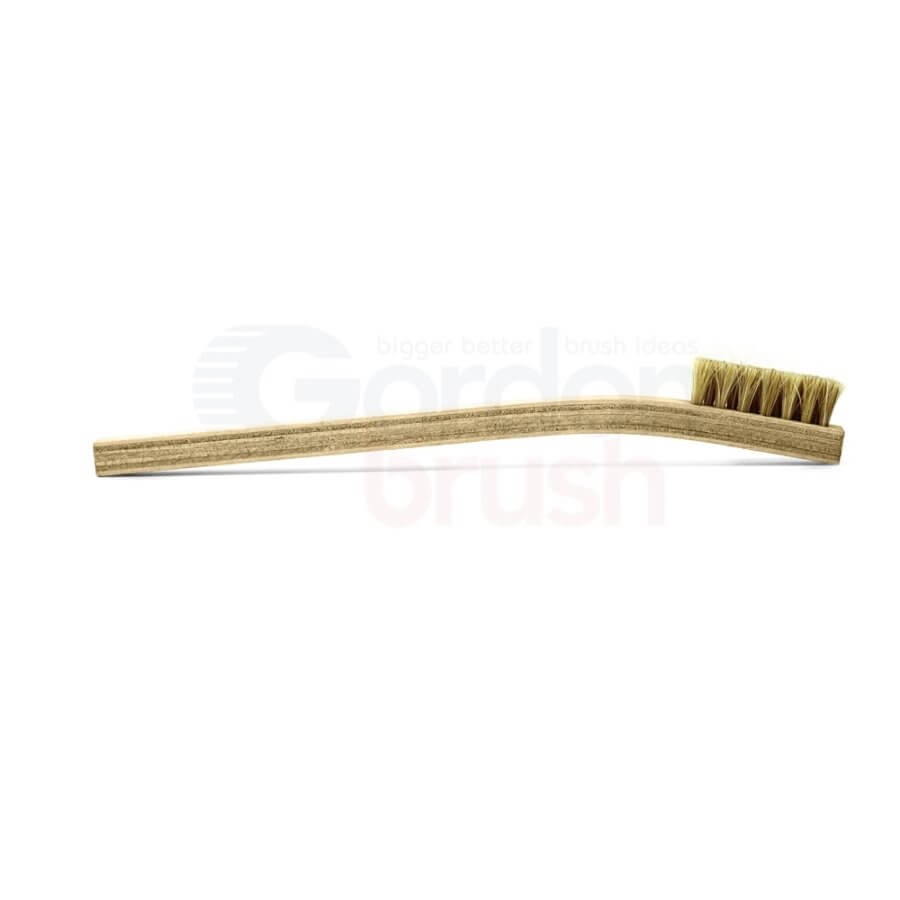 All-purpose toothbrush-style scratch brush, designed with a bend for knuckle protection. Heavy duty anti-static horse hair bristle, in a 3 X 7 row configuration, with a 7/16" trim, and a brush face of 1-3/8" x 1/4", with a strong, static-neutral plywood handle, makes a great tool that can be used for a wide variety of applications including board rework and cleanup.