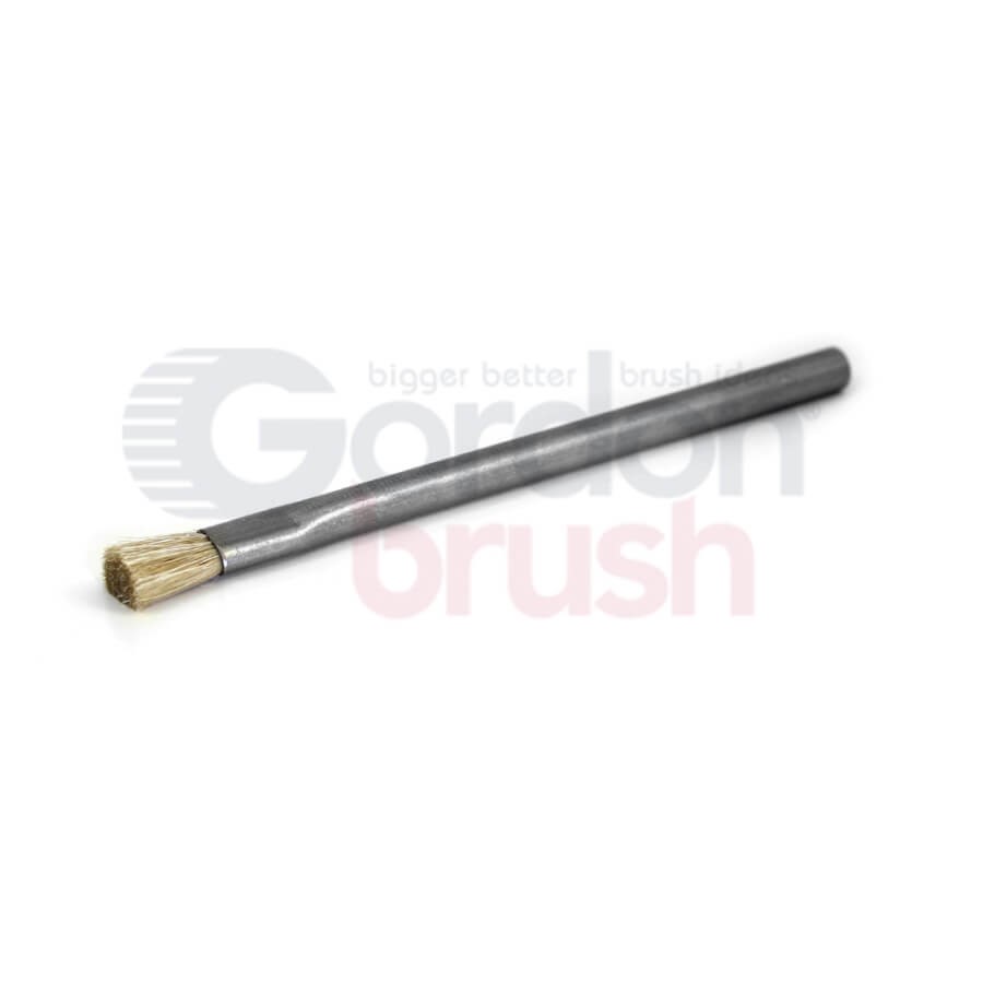 Applicator brush with anti-static horse hair and a chemical-resistant stainless steel tube handle. Constructed with strong mechanical clamping for maximum fill retention, and contains no adhesives that can leach out and contaminate work areas. 3/4" trim, brush face 1/2" wide, and a handle length of 6" x 3/8" diameter. This brush has a maximum use temperature of 370F.