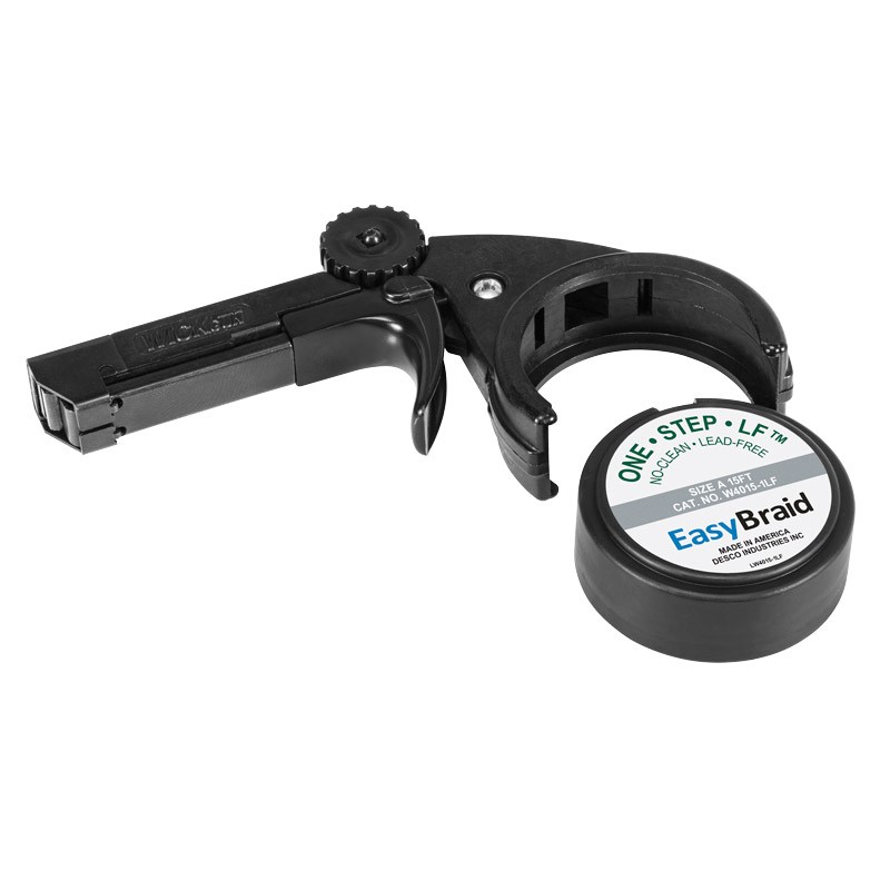 - Simple one-handed operation to dispense, position and cut off desoldering braid