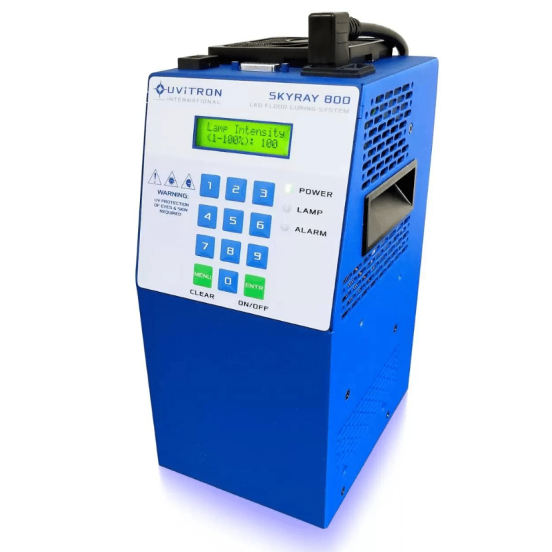 The SkyRay 800 is a compact microprocessor-controlled LED flood curing system. The SkyRay integrates all system components into a small lamp head which can be easily mounted anywhere on a factory floor, with no remote controller, power supply box or remote cooler required. Just mount the head, connect the AC power cord and start timed exposure curing! The long life solid-state LEDs illuminate a 5x5 inch curing area with cool and evenly distributed high intensity light. The system features an integrated exposure timer and adjustable output intensity. The front panel LCD display and sealed membrane type keypad make programming and monitoring of curing operations a snap. System dose and setup parameters feature password protection to prevent unauthorized changes to sensitive process and control settings. The unit features a variable speed cooling fan and convenient flush-mounted carrying handles. The enclosures slim design allows for side-by-side mounting of multiple units for exposure of larger curing areas.