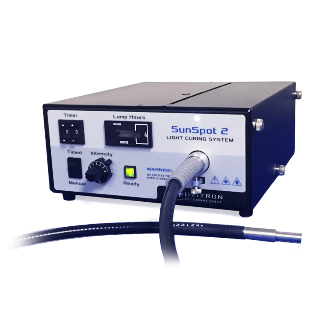 The SunSpot 2 is a next generation high intensity ultra-compact light curing system, and the industrys price/performance leader. The unit was designed with low cost of ownership in mind, with its long-life UV/visible arc lamp, and filtered input long-life light guide. The SunSpot features easy to use exposure time controls and foot pedal activation. The system weighs a mere 6 pounds, and its 10.5 x 8.6 x 4 inch size is the smallest in its class.