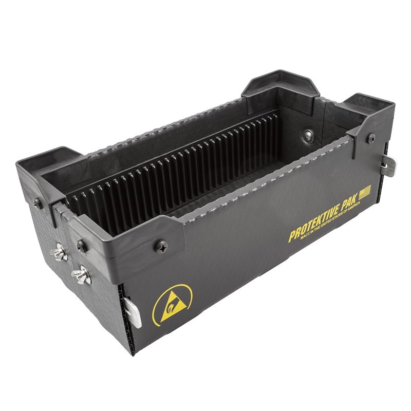 Constructed from an extruded high impact polypropylene material, yielding superior strength and durability from its inner honey-comb structure Conductive material <1 x 104 ohms provides a reliable path-to-ground Printed with ESD protective symbol as required by ANSI/ESD S541 Provides durable, physical protection Stackable tray design for maximum flexibility; reduces clutter and improves workflow by consolidating storage vertically, freeing up valuable workspace Expandable aluminum sliding plates expand and secure various PCB sizes with ribbed slots, enabling flexible, tool-free tray configurations Lightweight, ergonomic trays streamline transport between workstations or storage, reducing downtime, handling risks, and improving efficiency Chemical and moisture resistant Ideal for use where corrugated and/or paper products cannot be used Reusable, ensuring best value Product ships assembled Made in the United States of America